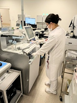 私たち検体検査室は、病院内で行う検査の中で、血液、生化学、感染症、腫瘍マーカー、尿、便などの検体検査を行っています。また日当直も行っており、24時間、365日、緊急検査に対応しています。