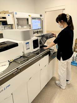 免疫染色を前処理も含め自動で行います。当院では適正な輸血管理を行う事で、輸血管理料Ⅰ、輸血適正使用加算を取得しています。